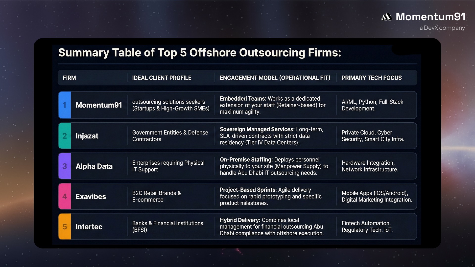 Explore how Momentum91 sets the standard for offshore outsourcing firms Abu Dhabi, transforming ideas into impactful, scalable products to help you move smarter, faster, and stronger.