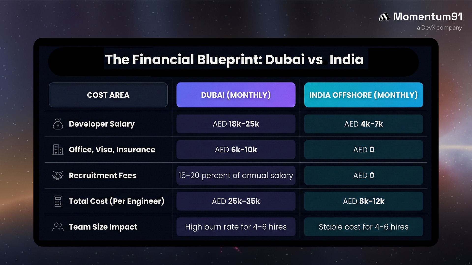 A local developer in Dubai can cost AED 25k to 35k once you add workspace, visa, insurance, and admin fees. With an offshore development team India for Dubai startups, the average cost per engineer is AED 8k to 12k including payroll, benefits, and workspace. This gap creates reliable cost effective development Dubai budgets.