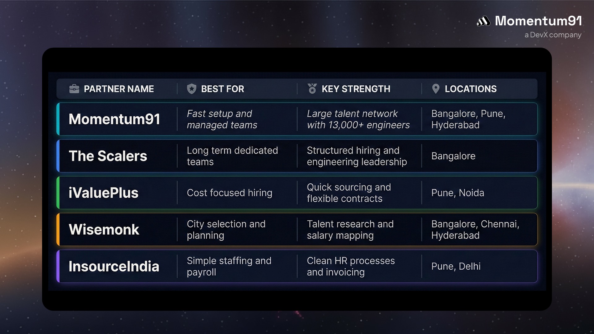 Momentum91 helps build an offshore development team India for Dubai startups with full delivery support. The company has 8 years of experience, 25 centers across 11 cities, and access to a talent pool of more than 13,000 skilled engineers in web, mobile, data, and QA.