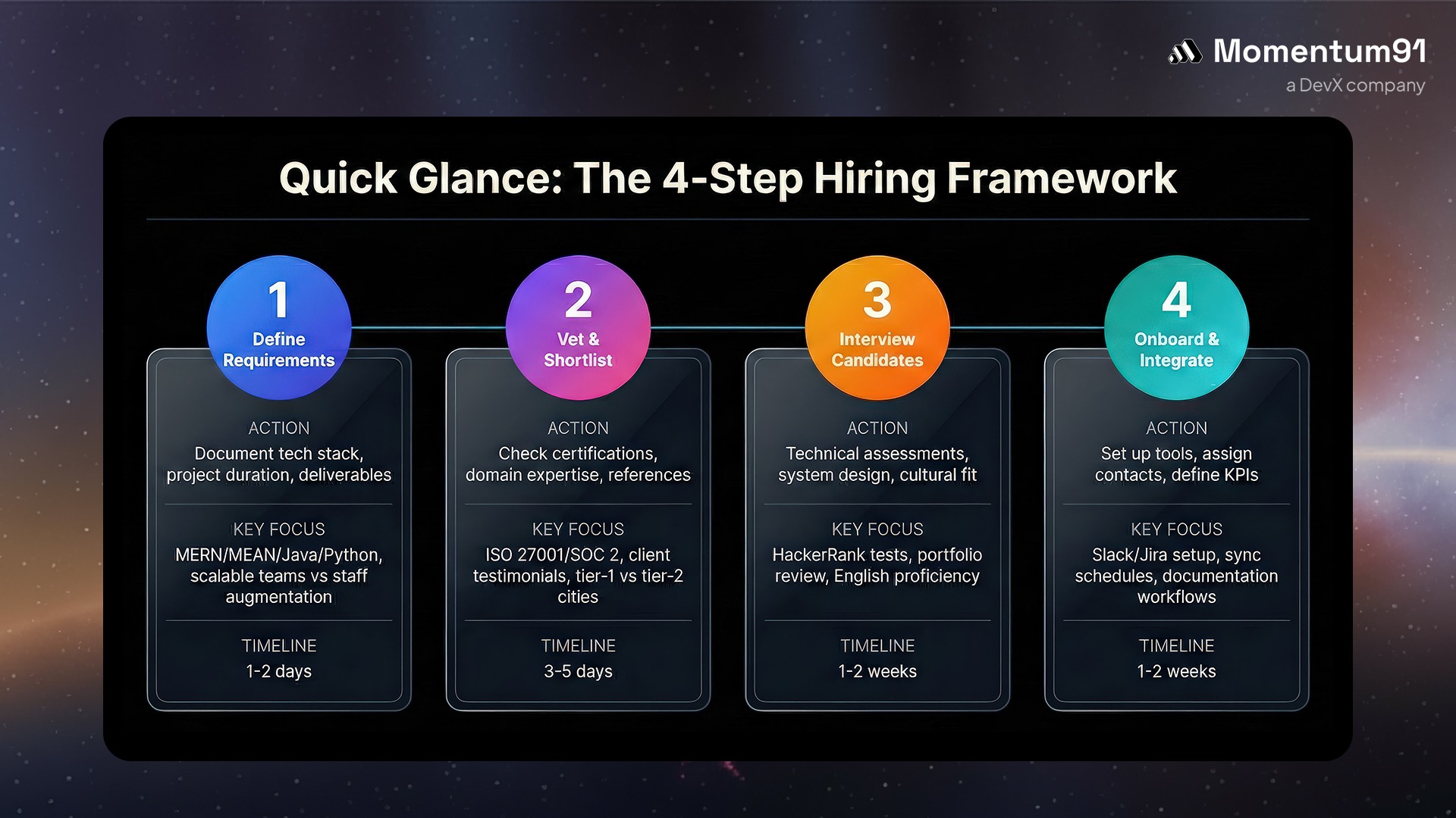 The developer hiring process takes 1-2 weeks with pre-vetted talent from dedicated development team services. Standard recruitment runs 3-4 weeks. Complete onboarding takes 4-6 weeks total, faster than local hiring's 4-6 months. Momentum91 accelerates this to 2-3 weeks with pre-screened candidates from the India tech talent pool, so you hire dedicated developers who start delivering immediately.