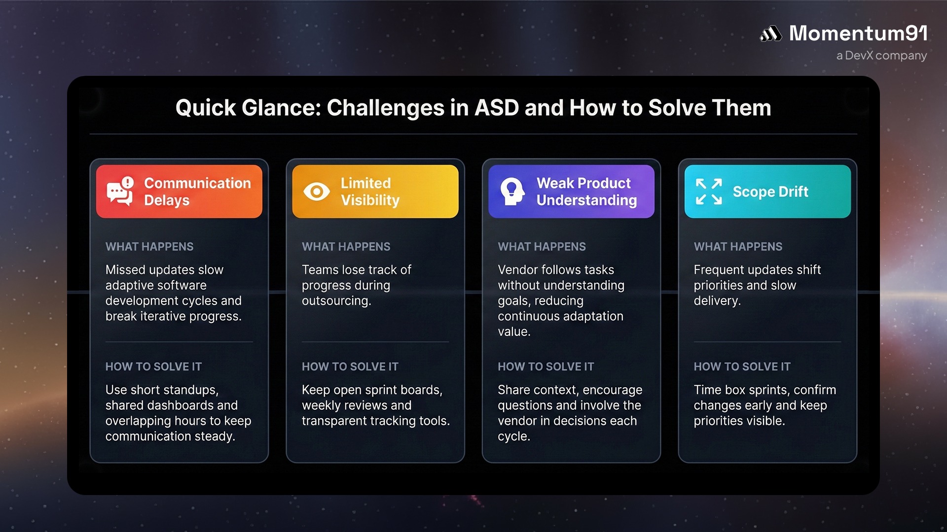 When ASD loses structure, issues grow quietly. Delays stack up, features miss user needs and the project moves away from its original goals. Teams spend more time fixing problems than moving forward, and progress becomes uncertain.