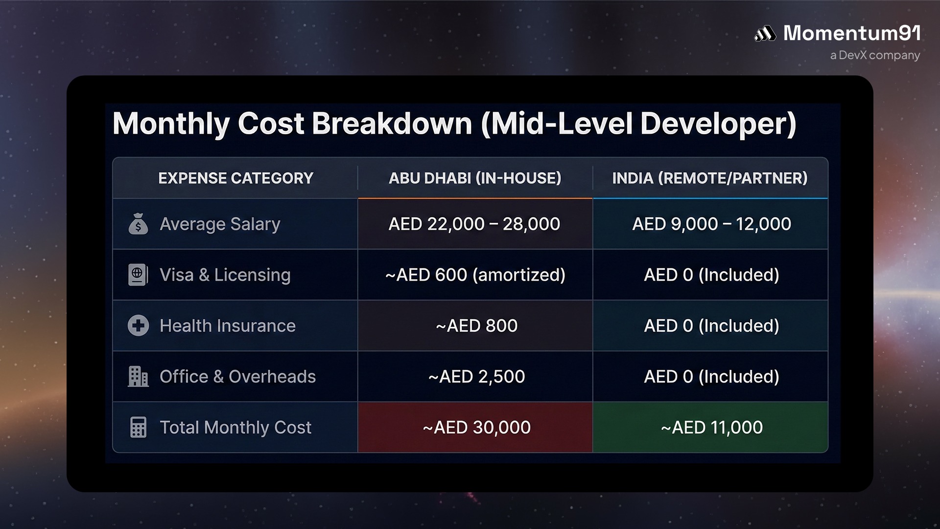 - Senior Dev: UAE ($80–120/hr) vs. India ($30–45/hr)