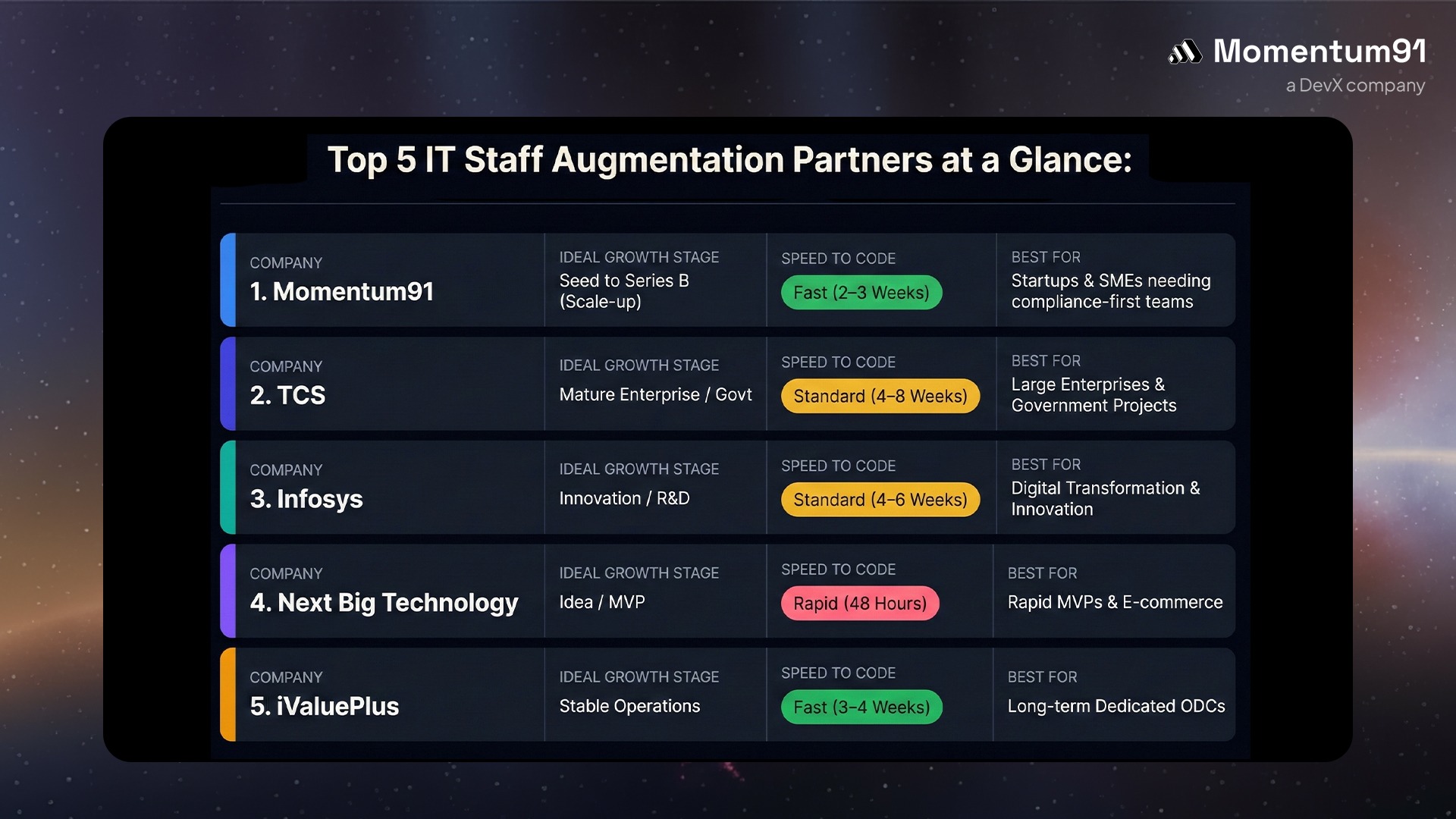 Why they are on the list: We rank Momentum91 as one of the top IT staff augmentation companies because they solve compliance headaches for SMEs. Their model gives you access to expert software developers India specialized in Python, React, and AI/ML.