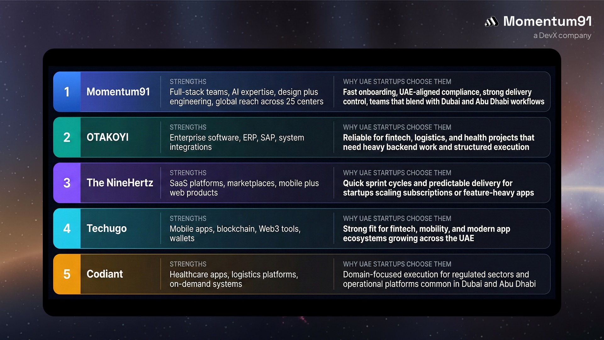 Explore how Momentum91 supports UAE startup tech outsourcing with stable, fast-moving teams that help you build smarter and scale faster. Start building your Momentum91 team today and move your product forward without delays.